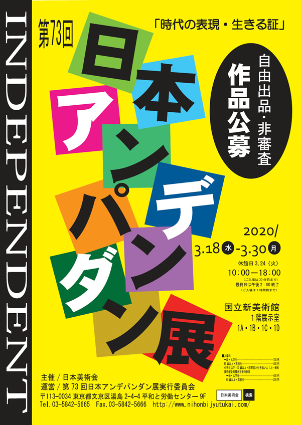前回は757人の出品者と2万人を越える鑑賞者が、様々な出会い、刺激を求 めて集いました。そんなアンデパンダン展に、平和と自由と創造の喜びを求め て、あなたも参加してみませんか。