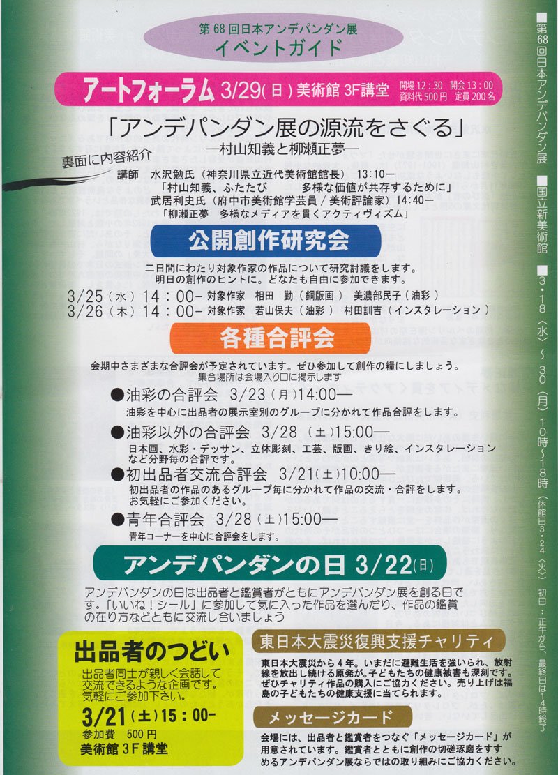美術館講堂でのアートフォーラムや研究会を始め、公開創作研究会や各種交流 合評会など多彩です。出品者のつどい(3.24)も盛大に予定しています。ぜひ参加して創作の糧に。