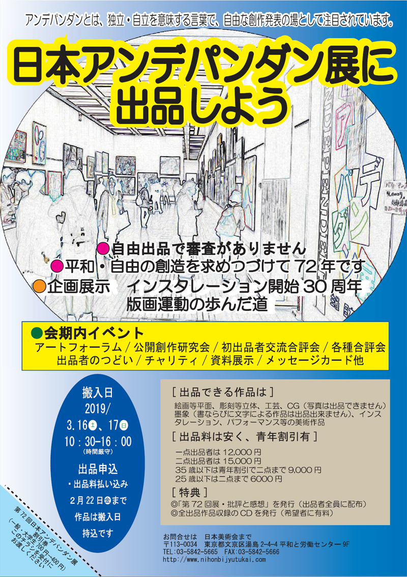 1884年以降フランスではじまった反アカデミズムを標榜したサロン・デ・ザルデス ト・ザンデパンダン展の精神を受け継いで、日本では1947年以来日本アンデパンダン展(主催:日本美術会)として受け継がれています。