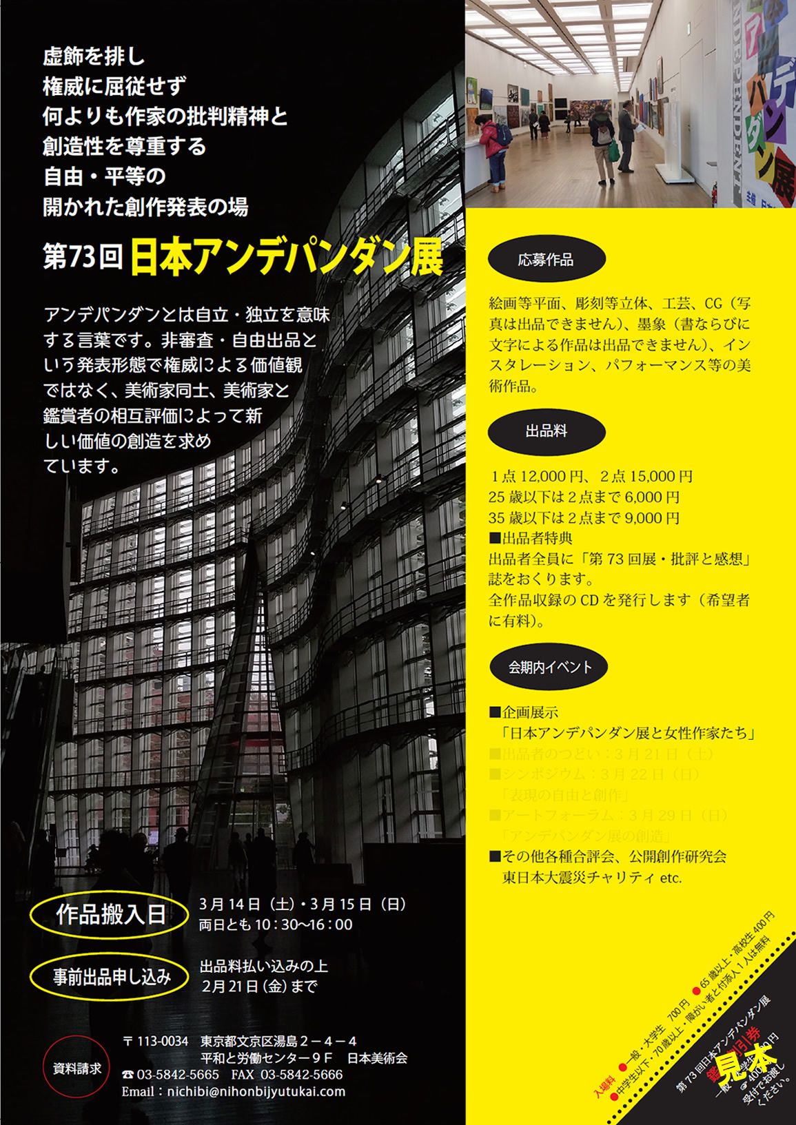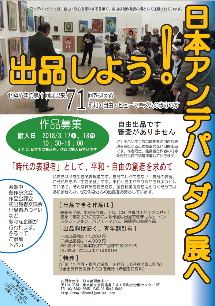 多彩な作品につつまれたアンデパンダン展はますます元気です。時代を見つめ、自由と平和を願う美術家の新しい創作が期待されます。ぜひあなたの作品を、審査の無い自由出品の第 78回日本アンデパンダン展に出品してみませんか。