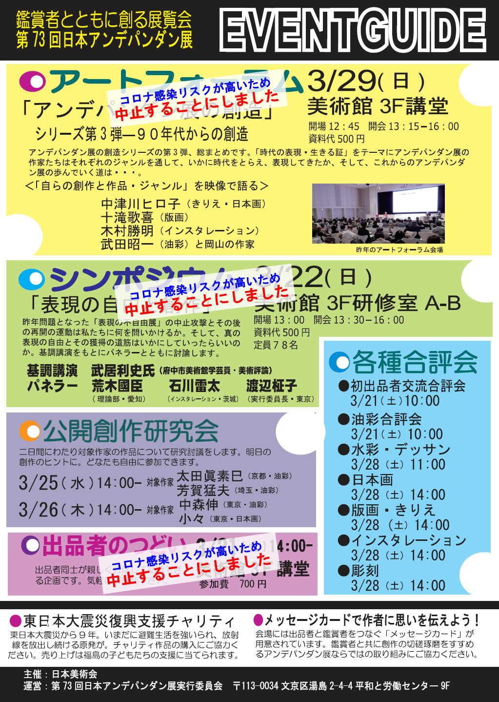 日本美術会の会員をはじめ、出品予定の皆様には、平和と自由の創造の場としてのアンデパンダン展を守り、発展させ、感染防止と「文化・美術の灯を掲げ続ける」ため、ぜひともこの難関を乗り越え、アンデパンダン展の開催・出品へ人一倍のご努力をお願いいたします。