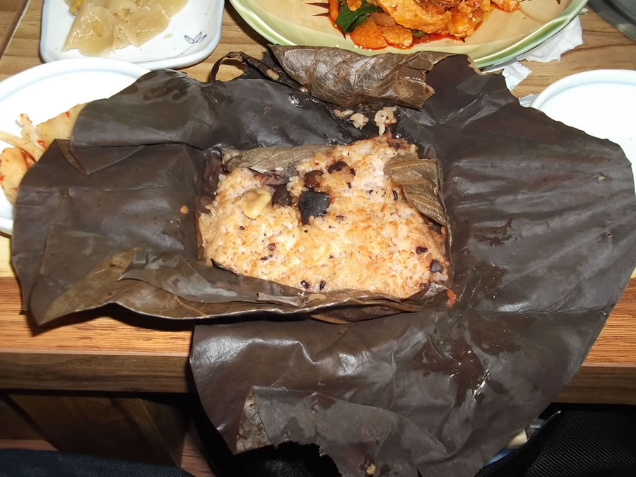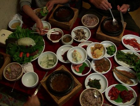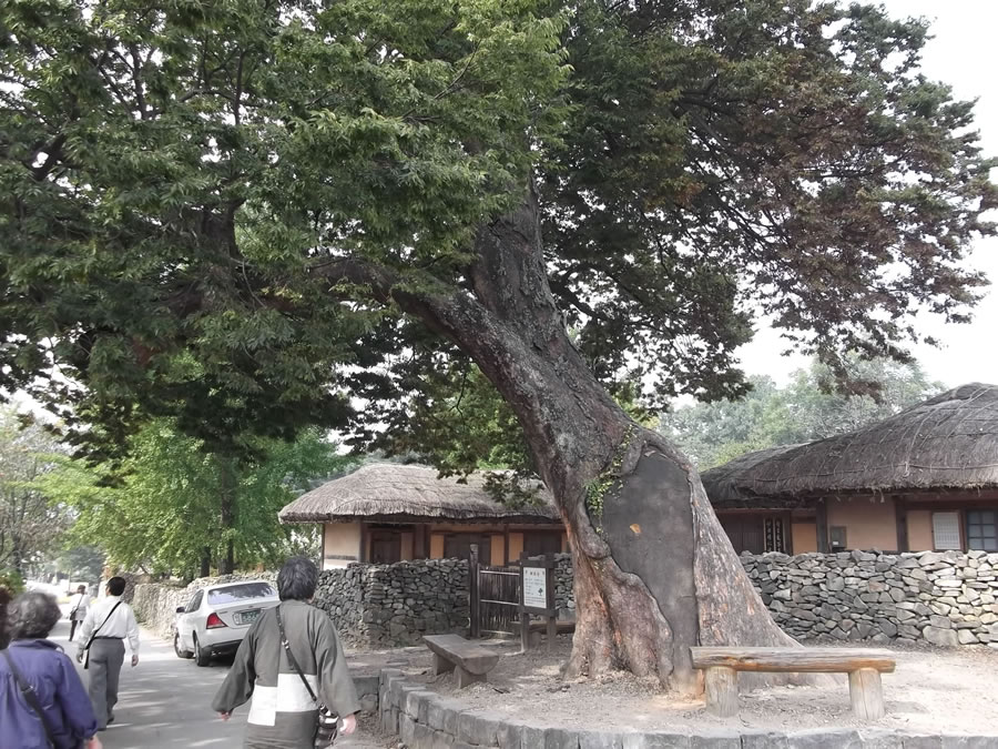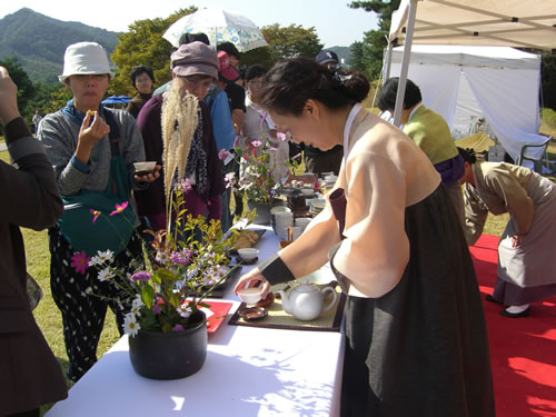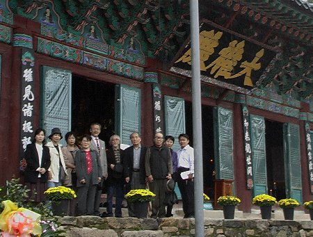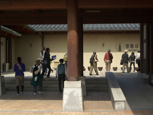 9日は「百済四王追慕祭」に参列。天女や雅楽や儒教式のそのセレモニーを興味深く見た。昼食後、公州の市場を歩き、公山城を散策。個々に街を散策した方も いた。城の前の広場で栗祭りのようなイベントやっていた。どうも百済文化祭が中止で、小規模にイベントがやられているらしい。ニューインフルエンザの影響 と説明があった。さて、公山城の城門で集合して、バスで鶏 龍山の甲寺(カプサ)に移動、老木が多いその寺を散策した。その奥にある伝統茶家で飲んだ、 黒く来いナツメの甘味のするお茶だった。その後下って門前街にある食堂で薬膳料理と云うのか、 ドングリの寒天のサラダ、人参もどきを焼肉のように焼いて食べ、マッコリを飲んだ。ここでソウルから合流した林さんが来て、今回参加の26名が全員そろっ た。タクシーで山道を登ってきた 時には心細かったらしい、林さんの言。夜は交流展の展示中で、呼び出されたり、宿にYATOOの友人が訪ねてきたりで忙しい夜になったが、毎回こんな感じ だ。