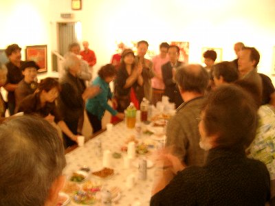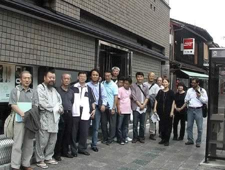 「日韓美術交流展」2006京都が17日に終了した。10名の韓国からの美術家(出品者)も無事帰国した。「京都市国際交流会 館展示室」と「アートスペース東山」の二会場を使っての展示、その作品セミナー(16日・参加約二十名)。オープニングパーティー(13日)はおよそ60 数名が参加して、催しなども盛会に開かれた。そして、京都観光は、京都実行委員会によるコーディネイトされた二条城・金閣寺・龍安寺・広隆寺など回った。 色々なお店(食事・ショッピング) など、相互理解の一端を担ったのではないか?と思う。また今回は宿舎の「日韓文化交流センター」での宿泊と朝食などの交流、「詩人尹東柱を偲ぶ京都の会」 の後半の通訳のサポートと韓国の美術による自主的な募金(記念碑建立の)などの交流、15日の京都アートカウンシルの町家を再生した画廊「小米庵」での パーティー招待。いろいろな文化交流の広がりがあった2回目の交流展だったと思う。同時期に「日本美術会京滋会員展」が別会場であって、地元には大変忙し い日々となったが、そこを韓国の方々を案内した時、U氏の奥様から皆さんへのお土産が配られたりして、暖かい心を感じたものだった。そういう意味でも広が りがあったとおもうが、なかでも 偶然、京都在住・台湾出身の水墨画家王氏が展示の中に二十二年前の恩師を見付け、感動的な再会を果たした場面も出現したりして、東アジアの交流へと展開し ていったのは、偶然とはいえ、今後のあるべき姿を垣間見た瞬間だった。17日晴れ渡った空の下、光運寺前にてバスをお見送りしたが、暖かい友情の気持ちが 湧き上がってきた事を報告しておこう。(文責・木村勝明)