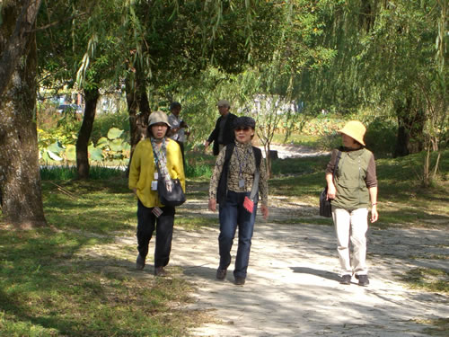 7 日に仁川空港で成田からの18名と、ソウルに先行1泊組み4人、関空からの3人の25名がそろい、公州から学生通訳の3人が迎えに来てくれて、4時過ぎ に出発、7時過ぎに公州に到着した。8日はまず、百済歴史博物館を見学し、映像やジオラマで百済の知識を入れ、扶余(プヨ)に向かったが有名な落花岩を川 から船で眺め、そこにのぼり、定林寺跡の仏塔を見て、その後昼食、宮南池を散策・スケッチなどして林立美術館での工芸展を見、その後「錦江アートセン ター」に到着、陶器に絵付けなど体験して、歓迎パーティーがそこのベランダで行なわれた。懐かしい顔と出会い、歓談したが、寒くなって来て、体調を崩した 人もいたようだった。