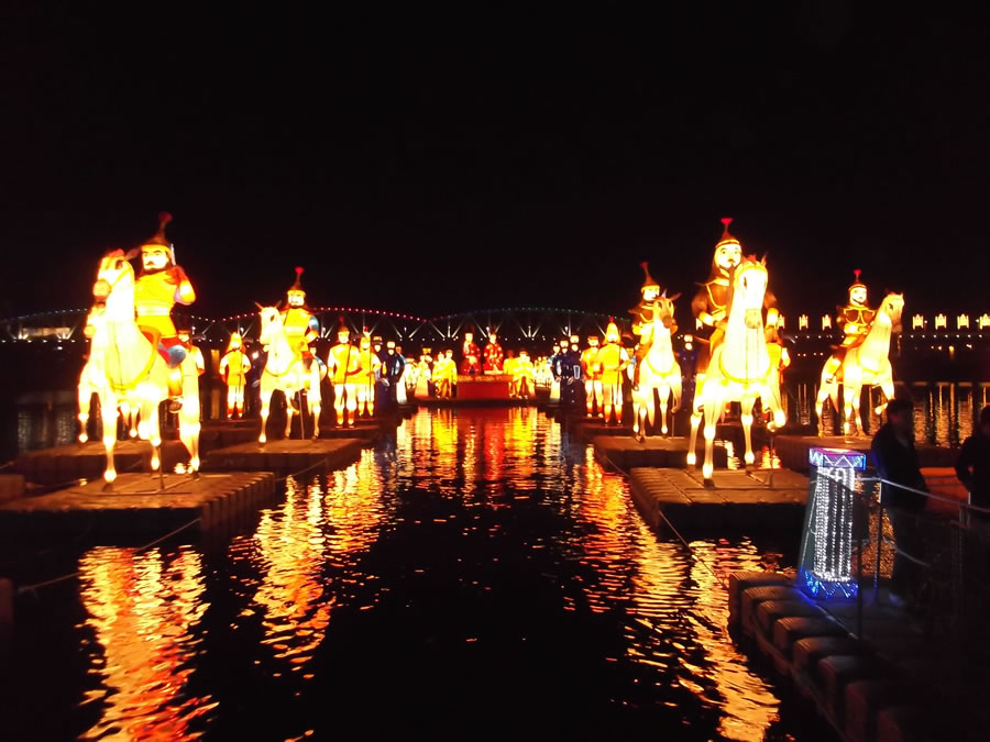 10月8日;扶餘博物館見学・午後は公州国際美術展のオープニングセレモニーに参加。日・韓美術交流展のオープニング。夜は、川のかかった浮橋を渡って公山城へ。川の中に設置された光のモニュメントが水に移り、美しかった。栗のマッコリを飲みながら城の前にある、栗祭りの市場の前で祭りの雰囲気を楽しんだ。