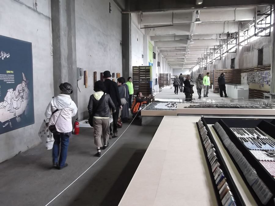 印象に残ったのは、8日の夜に見た光のモニュメントと、9日の清州国際工芸ビエンナーレだった。ビエンナーレ展は、たばこ工場跡の会場が面白く、天井の高さが8mくらいあり、工場跡のコンクリートの壁、広い会場に、世界中からの公募作品が並んでいた。日本人の作品もあり、ワークショップのブース・こども向け学習室などもあり、もっとゆっくり、時間をかけて観たかった。