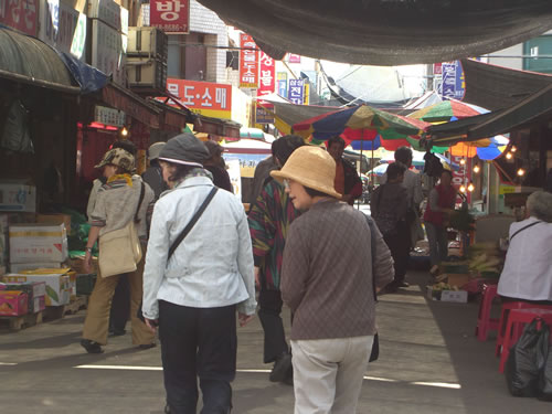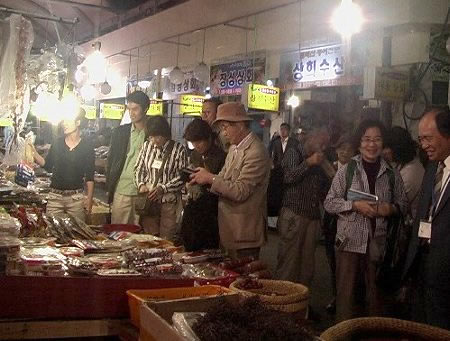 清州の市場を散策し、蓑を売っている店の前で、子供が悪いことをした時、蓑をかぶって、隣に行き、塩をもらってくるのだという話を聞いたり、お土産を買ったり、試食したり、清州の人の生活の一端がのぞけた。食べ物が安い。化粧品も安い。70円のエプロン、衣服も売っていた。カラフルな布団屋を始め、活気があった。