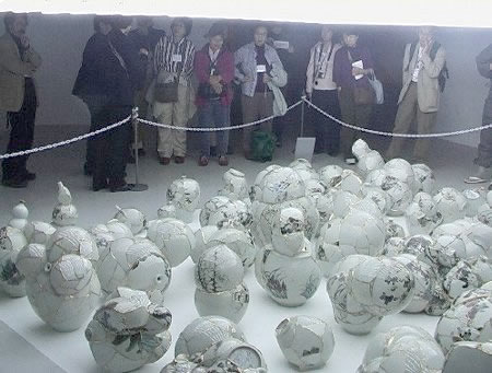 10月9日;清州国際工芸ビエンナーレ見学。清州は公州より人口も多く、たばこ工場の跡地を使った大掛かりな公募・企画・展覧会で、工芸と言っても現代アートに近い作品が多く、興味深く、面白かった。案内してくれたユンさんは、去年日本美術会の事務所を訪ねて来てくれた人で、韓国伝統の御茶席を準備してくれたりと歓迎してくれ、テレビのインタビューも受けたりした。