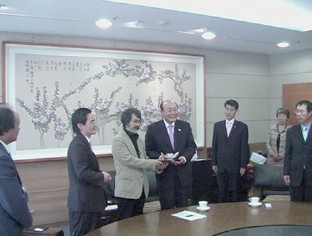 画廊の幾つかの個展では、作家との交流もあったし、月出山のスケッチには光州の風景画家らが同行してくれた。 市長さんへは、わが会の彫刻家・冨田憲二氏から古代からの民族の交流を象徴する船のテラコッタがプレゼントされた。(市長さんからはネクタイのお土産をい ただいた)