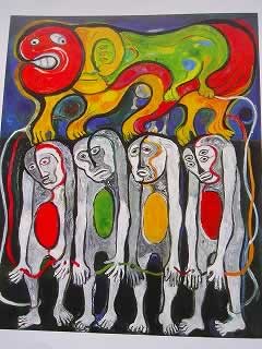 5月24日に友人と二人で「EXIPO ARTE BA 2005」を見に行きました。BAはブエノス・アイレス の略字です。このエキスポはブエノスアイレスにある80軒位のギャラリーが一堂に会し、各ブースを借りて自分のギャラリーで扱っている作家の作品を紹介 し、即売もしていました。20ドルの小さな作品から3万ドルの作品もあります。大木をくりぬいて作った彫刻、針金にカラフルな布を巻き付けて作ったオブ ジェ、木を細く削って色を塗り貼りあわせた作品、油彩、水彩、木の板を彫って彩色した作品と多種に並んでいました。